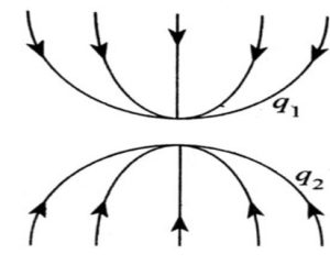 18. चित्र दर्शाता है कि दो आवेशों q1 और q2 के कारण विद्युत क्षेत्र रेखा पर आवेशों का बाहरी चिन्ह क्या है ?
